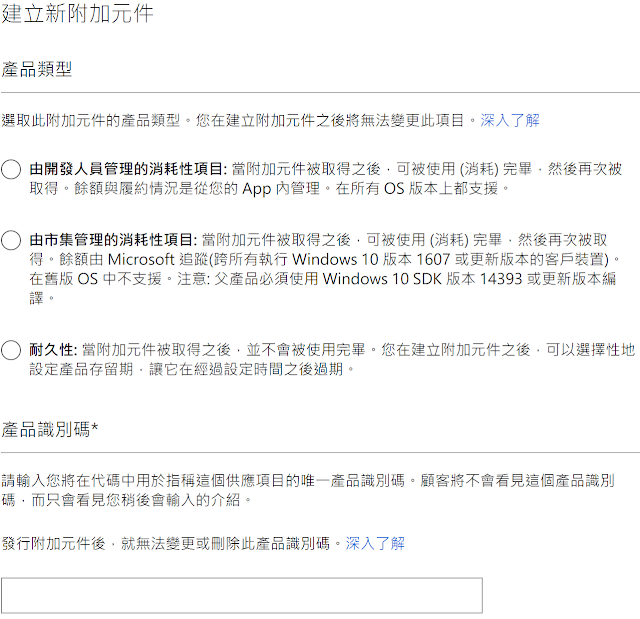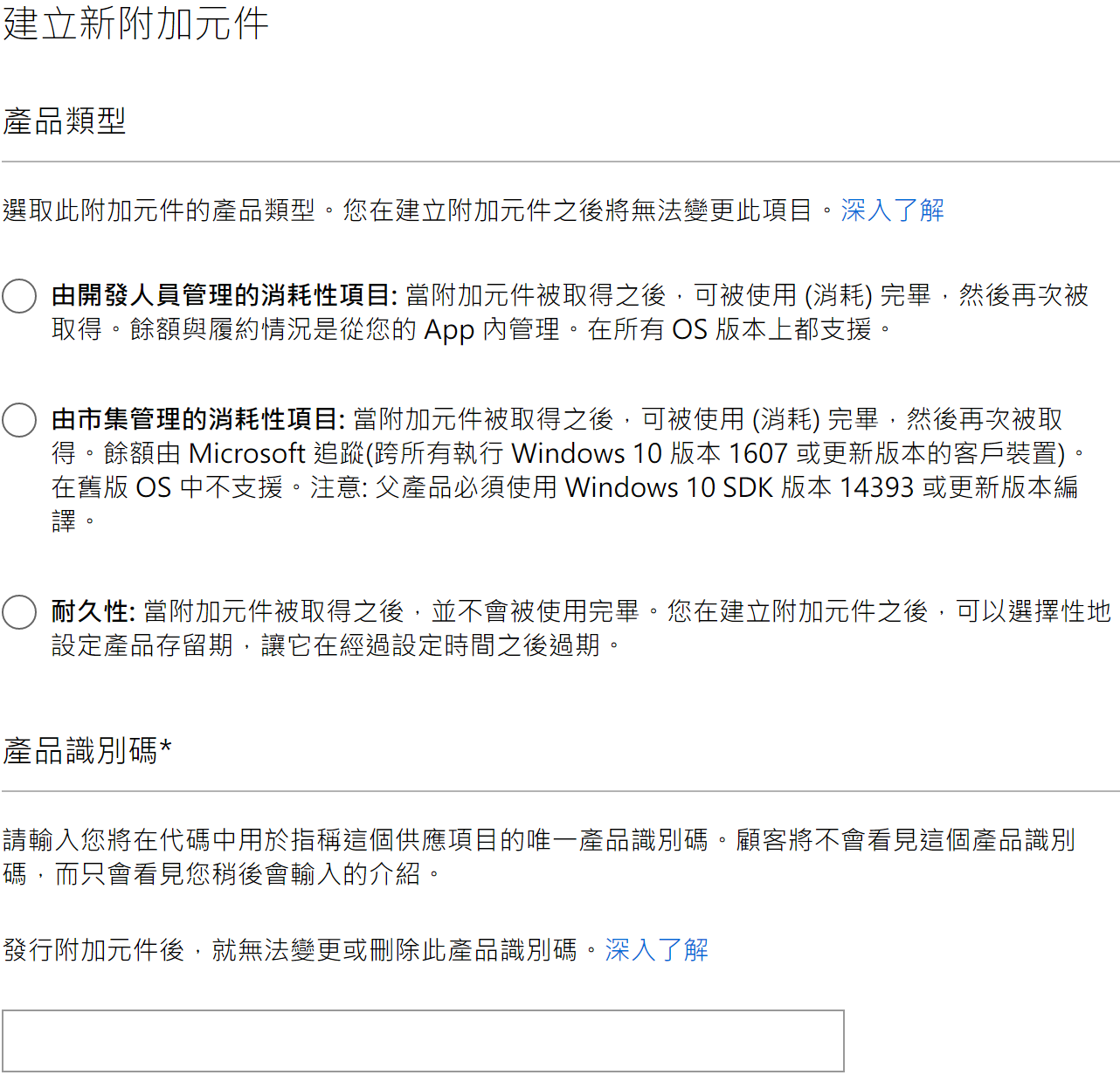 拿到 StoreContext 之後就可以往下操作需要的任務。 1. 在 Dev Center 建立 add-ons 的產品:(使用單一用戶爲例)