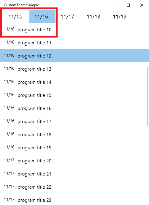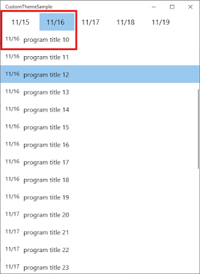 <ListView Grid.Row="0" ItemsSource="{x:Bind ViewModel.GroupDateTime}" ScrollViewer.HorizontalScrollBarVisibility="Visible" ScrollViewer.HorizontalScrollMode="Enabled" Margin="10,0" SelectedIndex="{x:Bind ViewModel.DateSelectedIndex, Mode=TwoWay}">