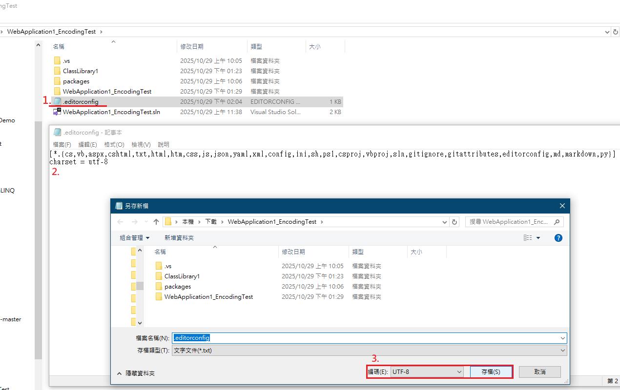 ※留意僅管使用此方法,Visual Studio在建立新檔案時,仍然為預設的UTF8 with BOM編碼,你必須再透過Visual Studio編輯/寫檔,該檔案才會變成 .editorconfig 指定的編碼