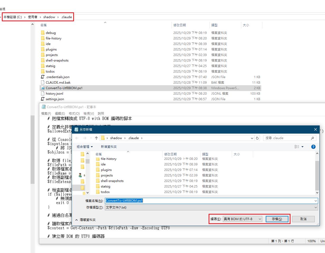 1.Claude Code額外使用 Powershell 把寫完的檔案轉換成UTF8 with BOM,但每次 Powershell 腳本都寫得不一樣、不太穩定