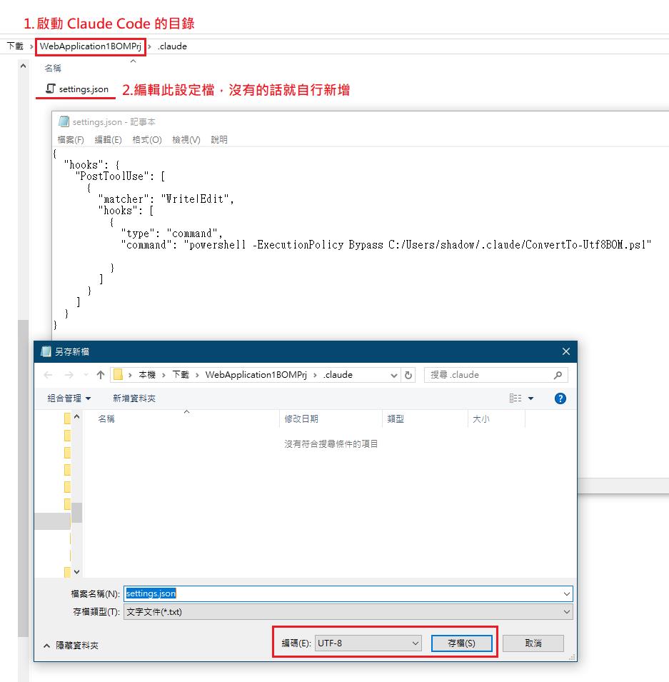 2.調整 Claude Code 寫檔的編碼為UTF8 with BOM 以支援 ASP.NET (.Net Framework) 網站的開發