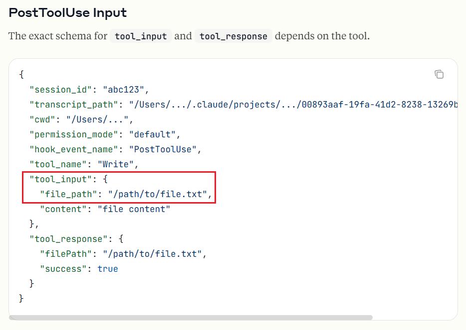 `$filePath = $objJson.tool_input.file_path`:Claude Code 執行內部工具觸發 Hooks 會傳遞給你的 Powershell 參數請參考官網↓