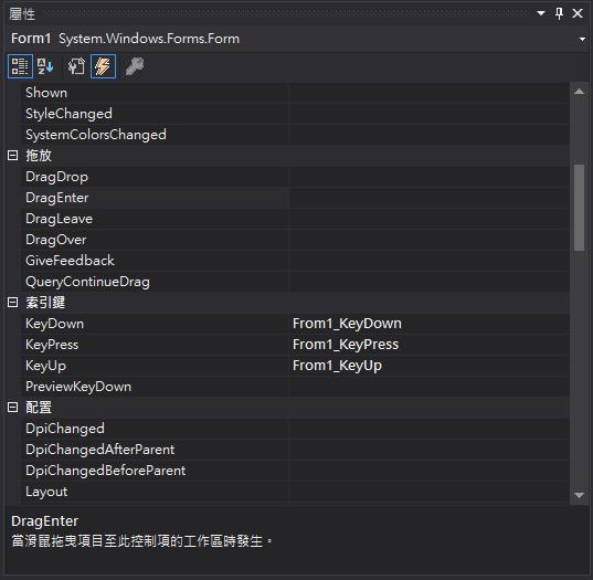 2. 在視窗表單(From1)屬性,點選事件(閃電符號),新增索引鍵(如圖,點擊兩下即可)