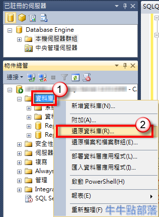 - 在資料庫點選右鍵,選擇 [還原資料庫…]: