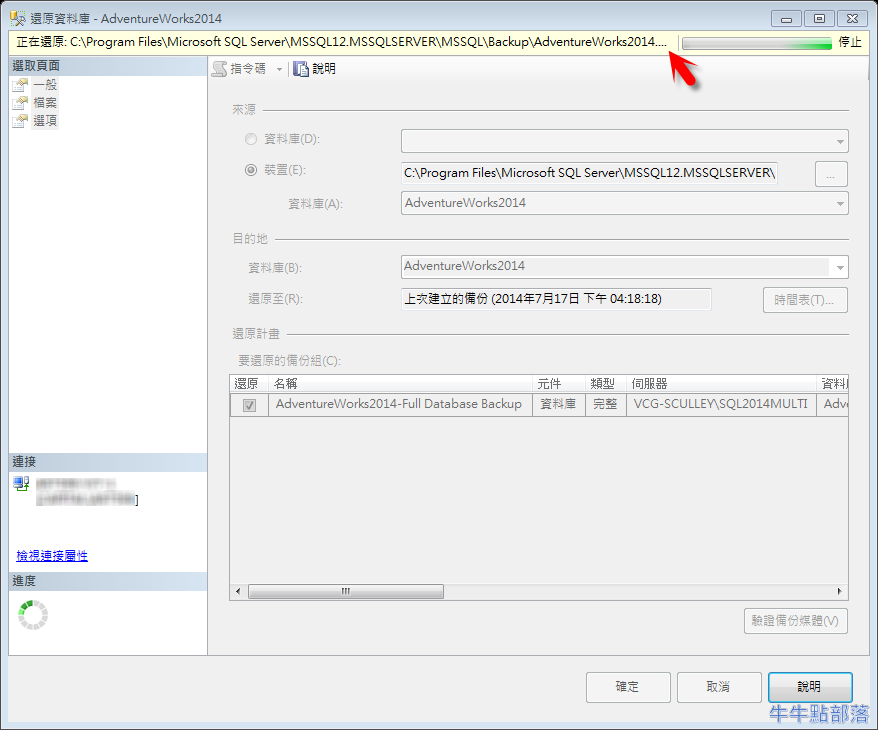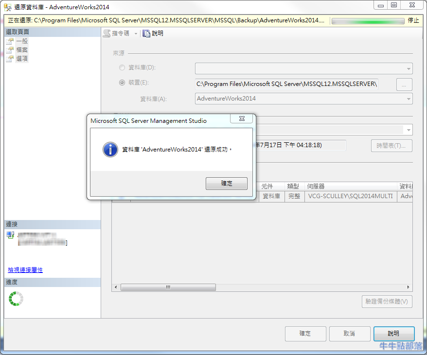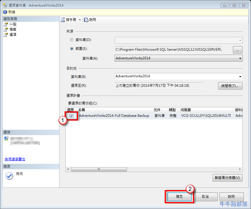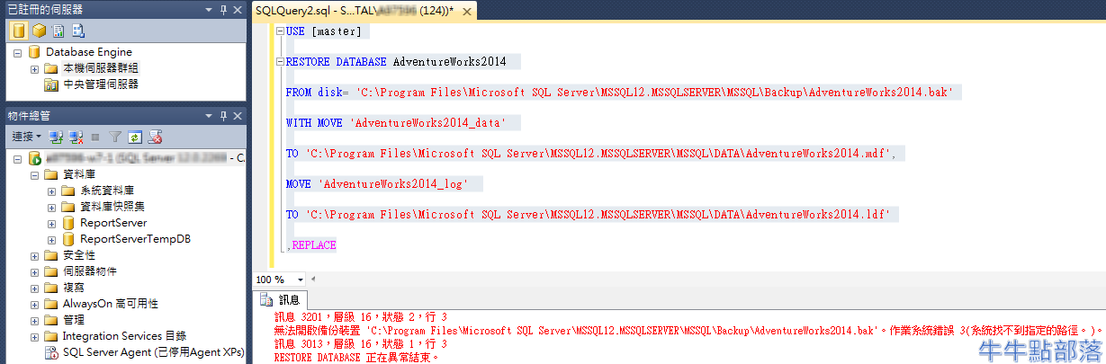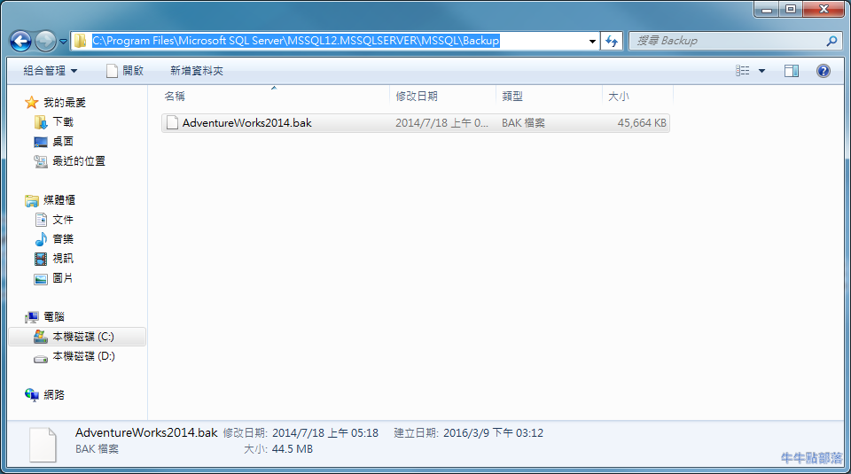 將資料庫備份檔案 AdventureWorks2014.bak 放置在 C:\Program Files\Microsoft SQL Server\MSSQL12.MSSQLSERVER\MSSQL\Backup\,執行以下指令: