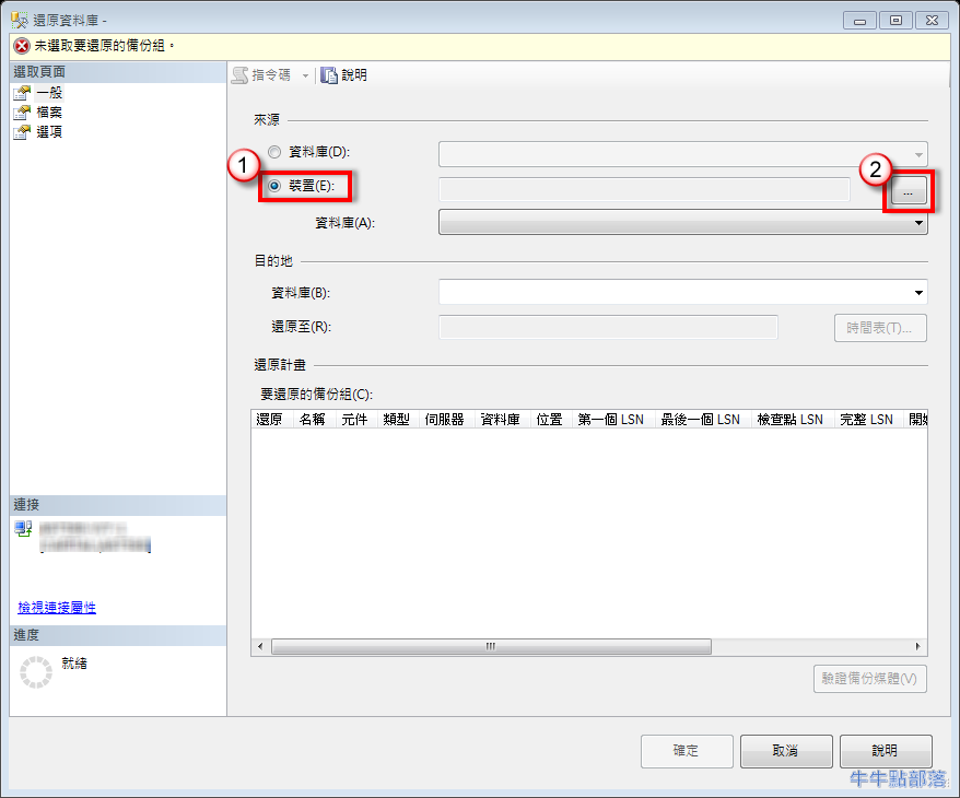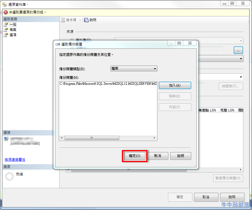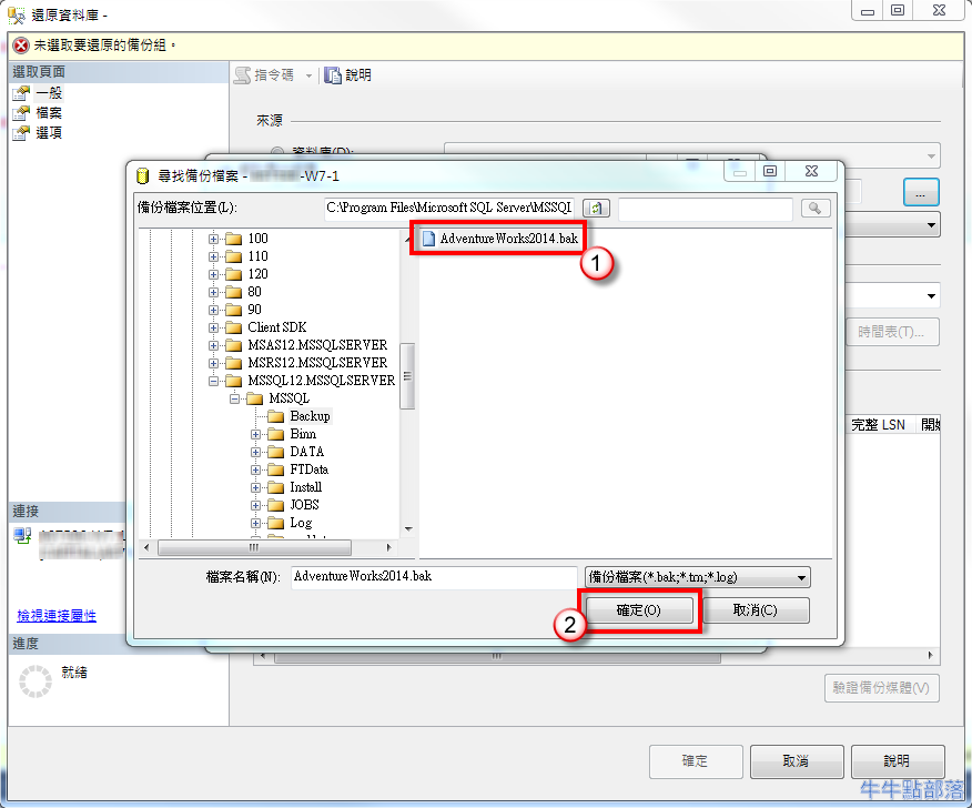 - 選取要還原的 .bak 檔案,點選 [確定]: