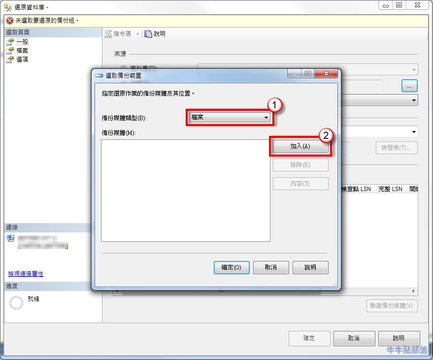 - [備份媒體類型] 選擇 [檔案],點選 [加入]: