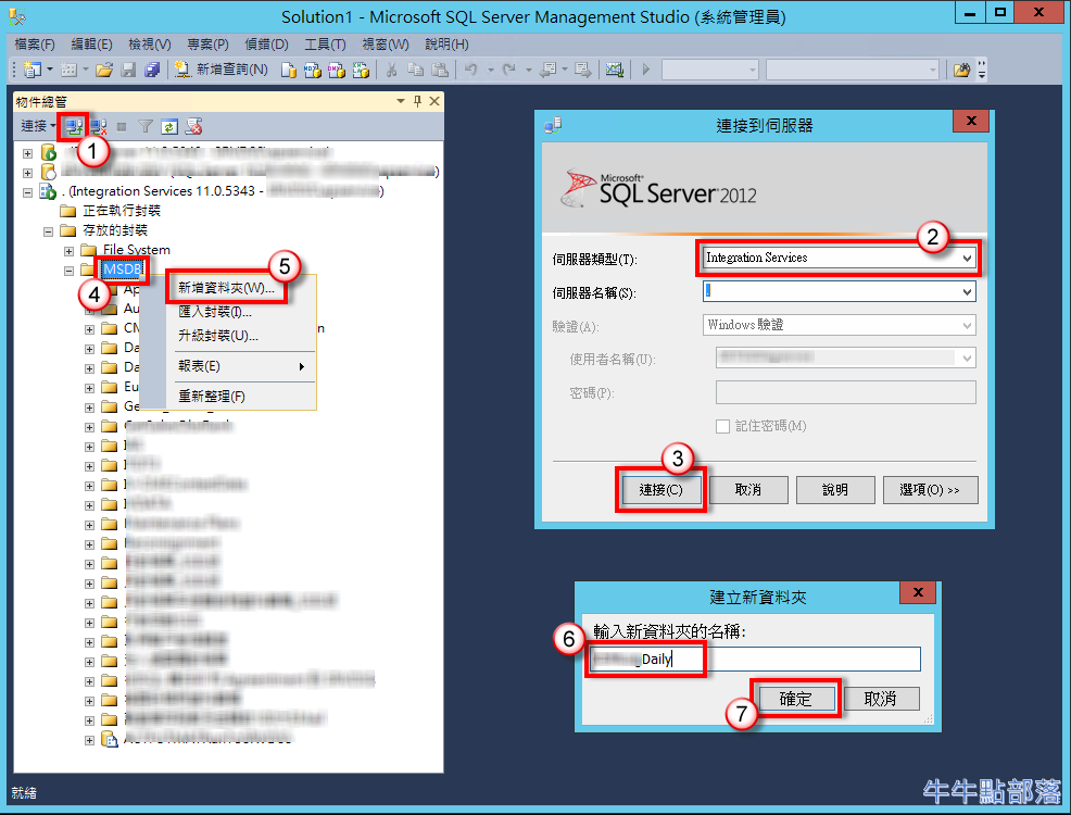 - 開啟 SQL Management Studio,連線到 [Integration Service] 伺服器,[存放的封裝] > 右鍵點選 [MSDB] > [新增資料夾...] > 輸入要存放封裝的資料夾名稱 > [確定]:
