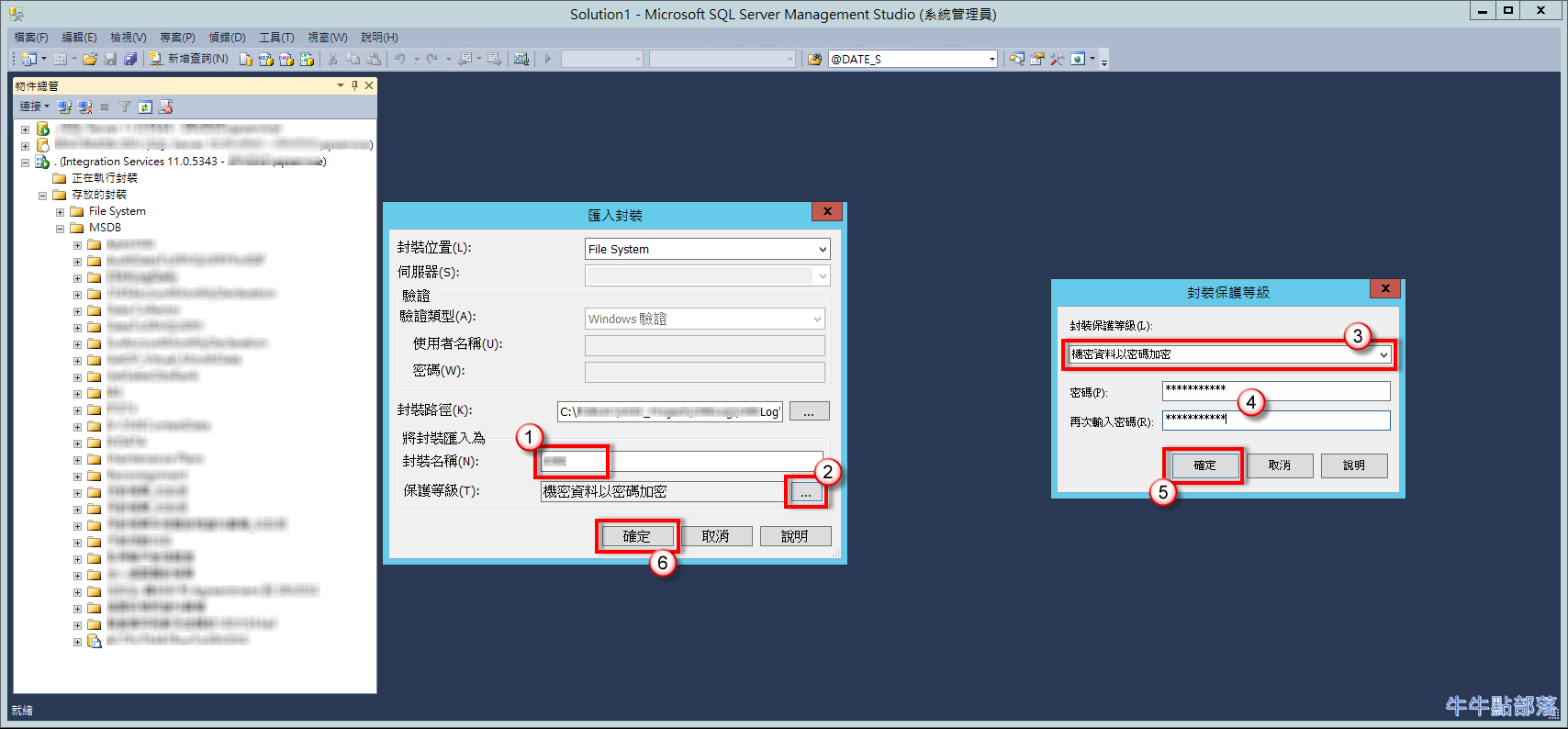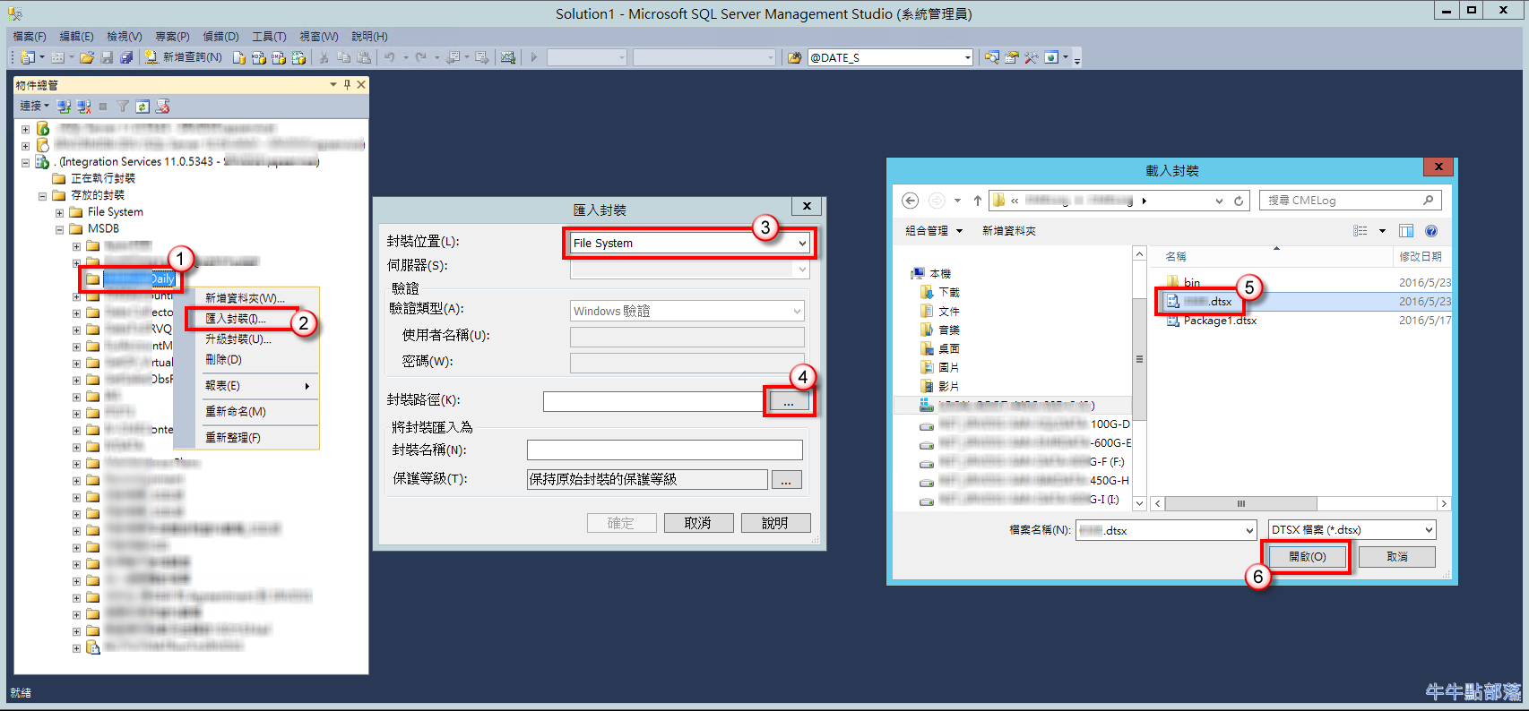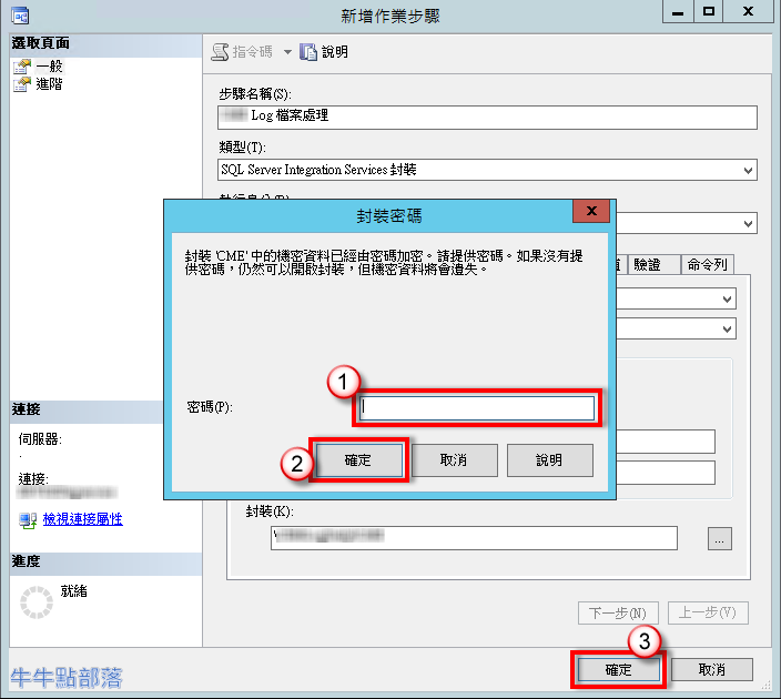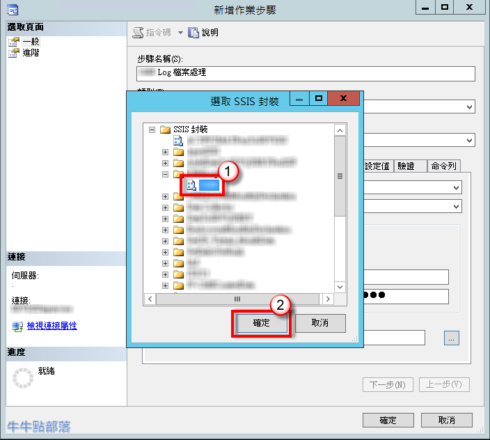 - 輸入步驟名稱 > 選擇類型 [SQL Server Integration Servieces 封裝] > 輸入SQL伺服器名稱、帳號、密碼 > 選擇封裝位置: