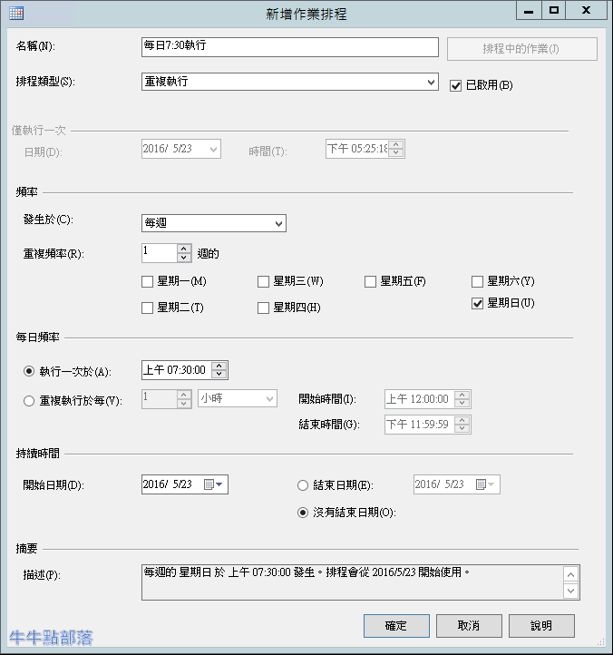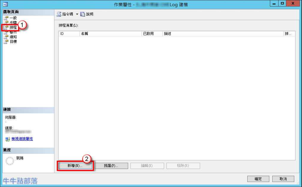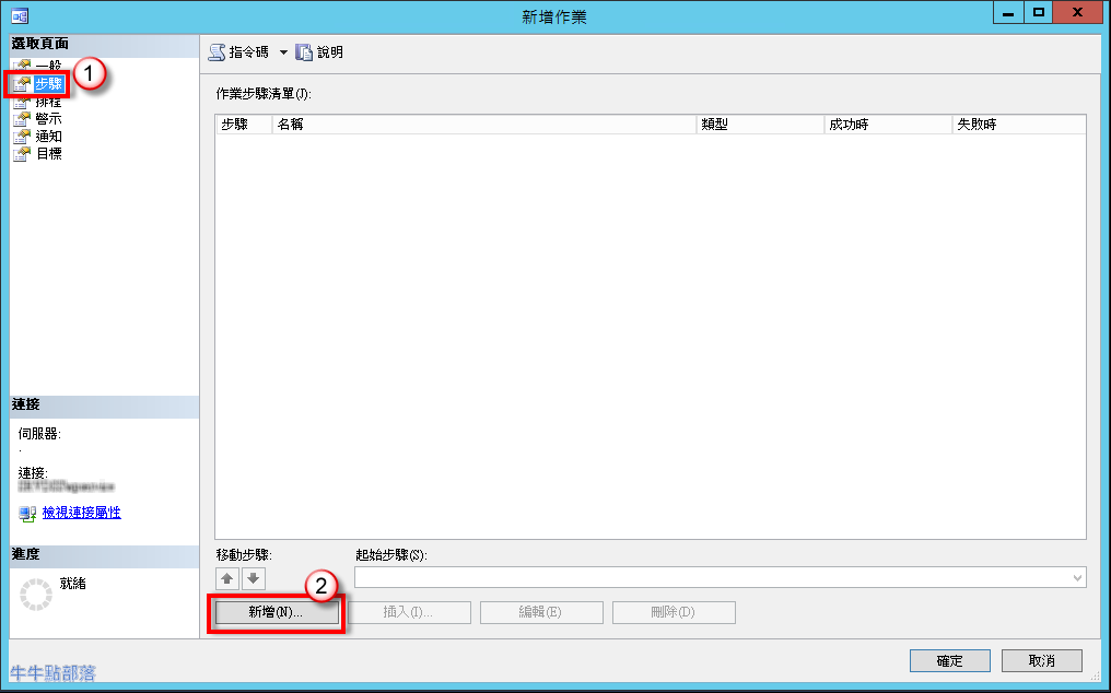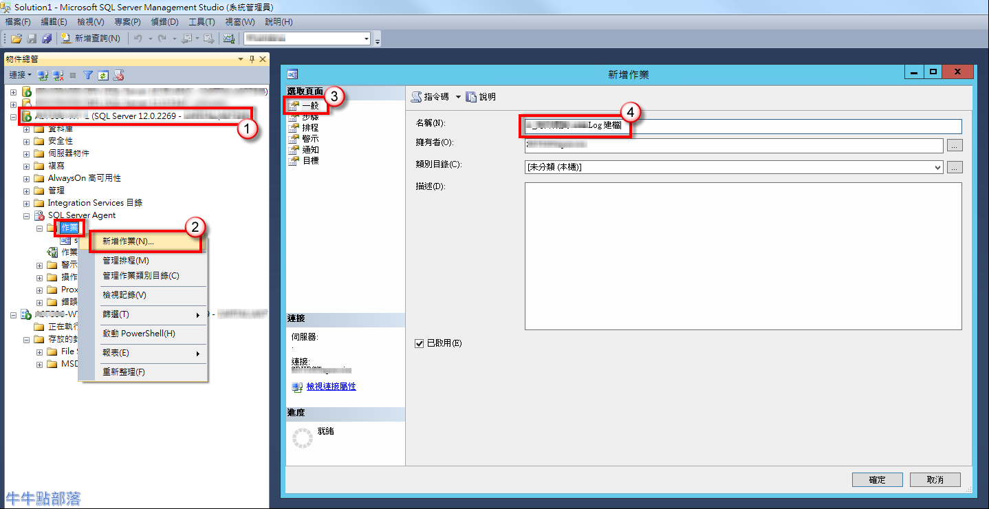 - 在 SQL Server Agent / 作業,點選右鍵,選取 [新增作業…],輸入作業名稱: