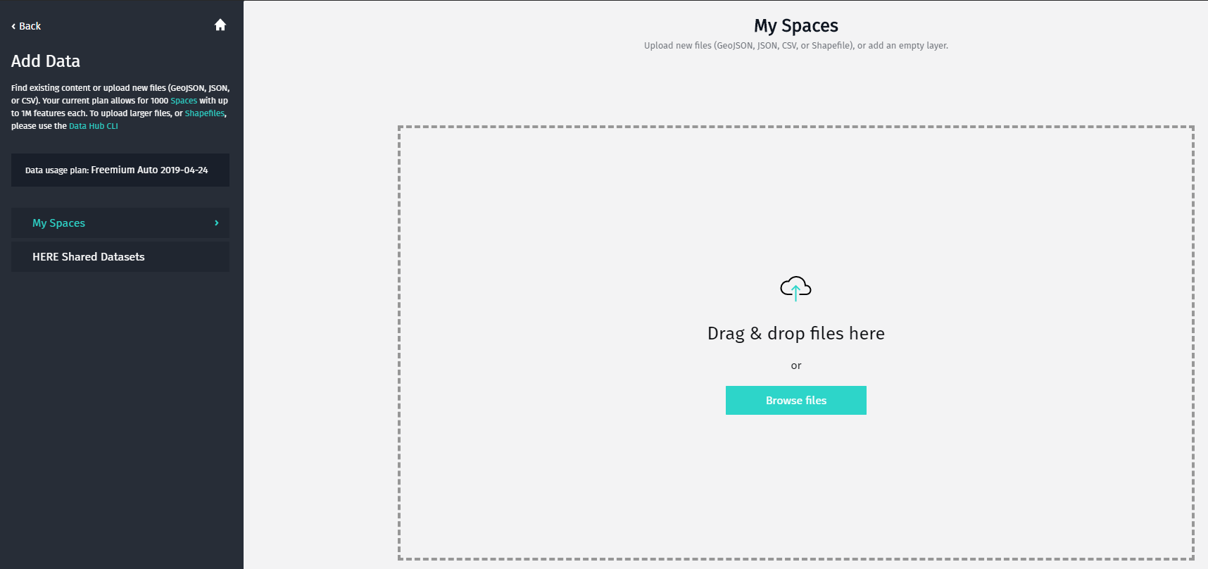 HERE Studio支援GeoJSON、JSON、CSV、Sharpfile等格式,您可以點選畫面中間的【Browse files】來選擇要上傳的檔案,也可以把檔案拖曳到下圖的虛線方框中間來上傳檔案。