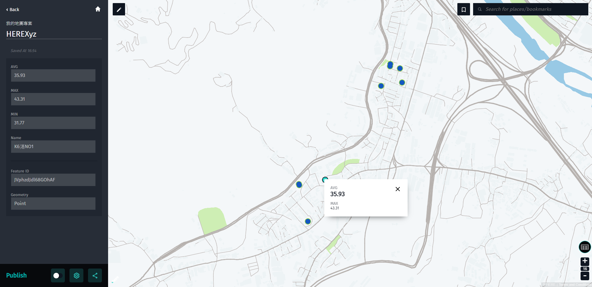 HERE Studio就會自動把資料集中的資料點載入至地圖圖層。