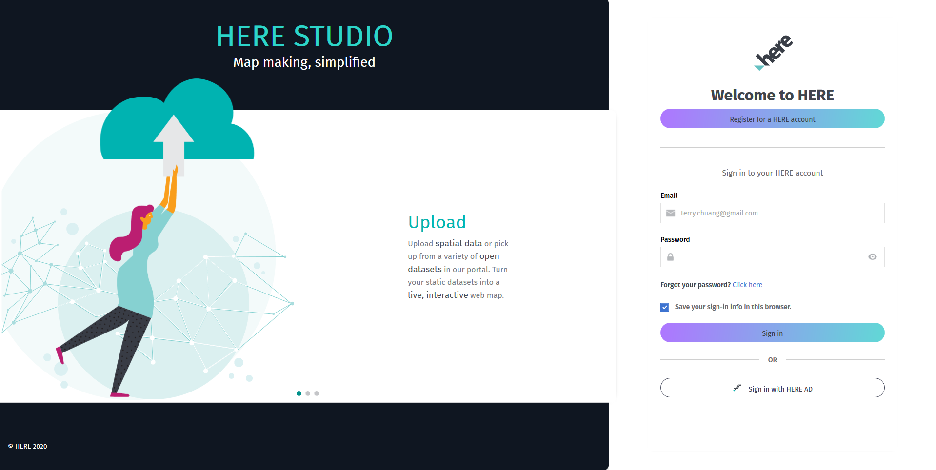 在開始使用HERE Studio前,一樣需要建立帳號,在此就不贅述建立帳號的步驟,基本上就是填寫註冊表單即可,若您有HERE帳號也可直接登入。