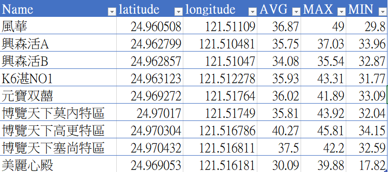 在此我們準備一個CSV檔案,內容如下圖所示,在這個示範最重要的是必須包含有經緯度的資料,其他欄位則是屬於描述欄位,可以視情況來增減。