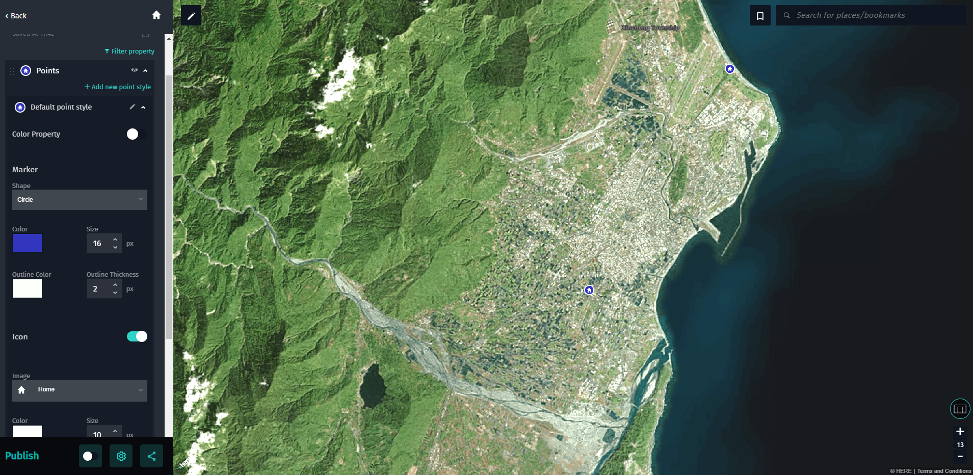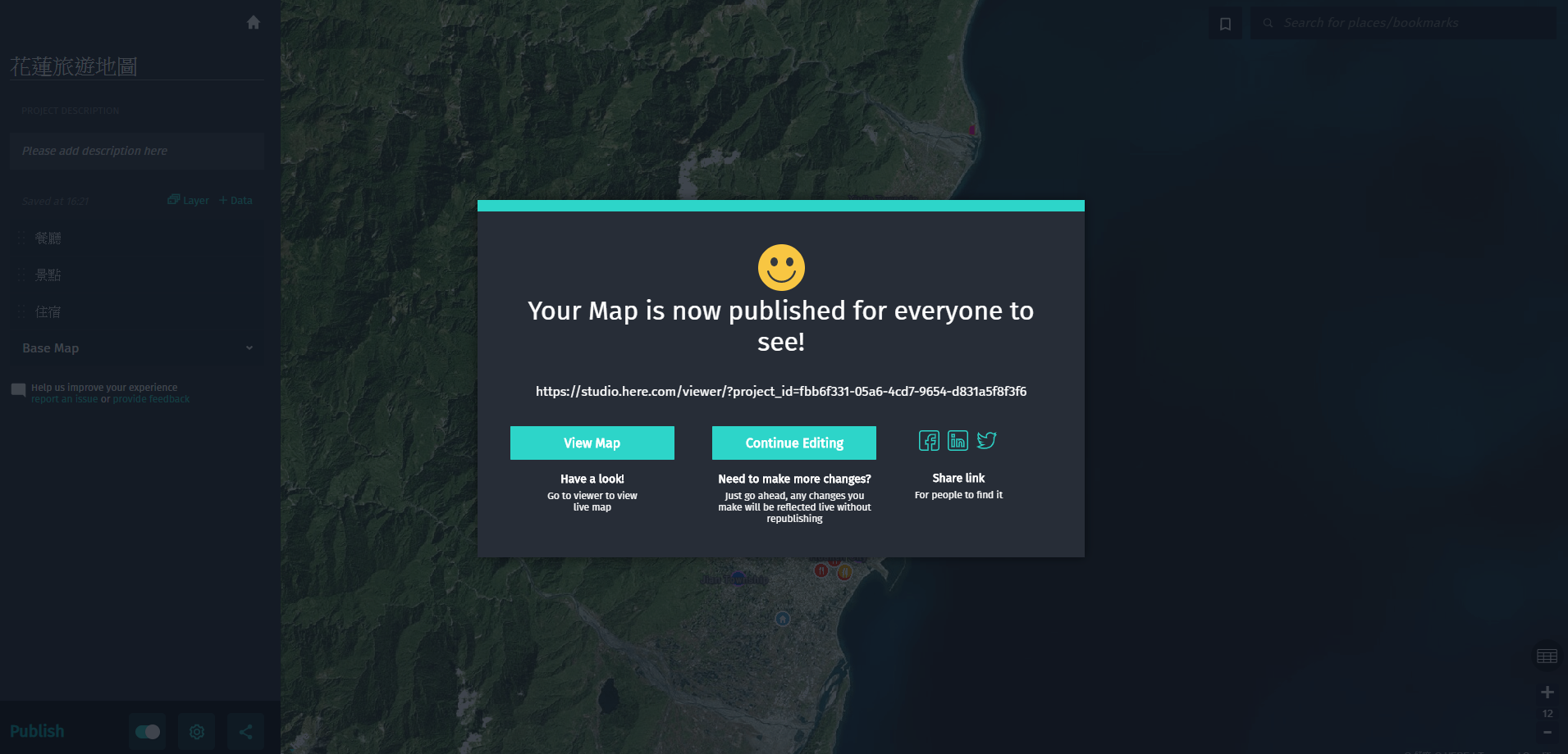 最後只要把您做好的地圖發布並分享出去,就可以讓其他人存取,甚至可以結合HERE API來做更多應用。