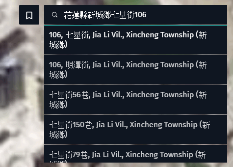 在地圖右上角輸入住宿地點的地址,在此不需要輸入號,以【看見七星潭】民宿的地址為例,請輸入【花蓮縣新城鄉七星街106】即可,才會看到系統提示的地址選項,點選第一個地址,HERE Studio就會把地圖定位並放大至該地點。