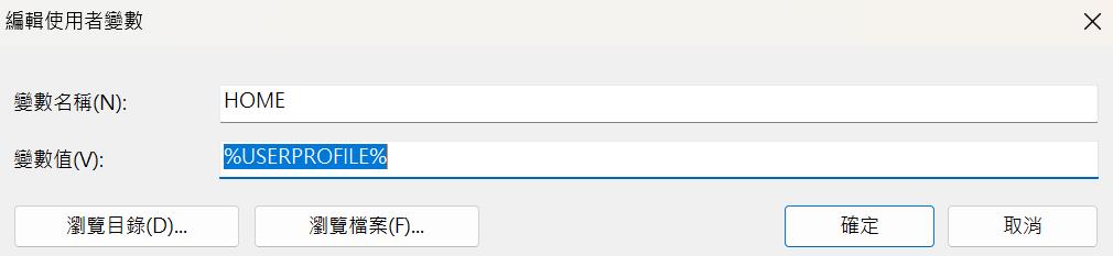 新增一個使用者變數,名稱是【HOME】,值設定為【%USERPROFILE%】