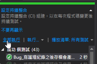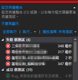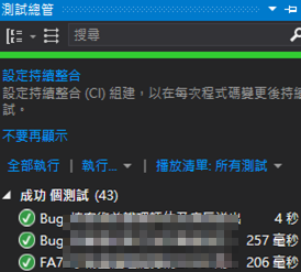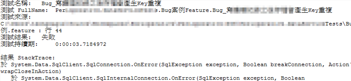 另外需要檢討的地方。因為整個過程中還是偏重在用specflow做整合測試,真正應該做為基礎的單元測試反而被我刻意忽略掉。又因為解bug而調整程式邏輯,進而造成與原先寫好的測試情境預期不一致。