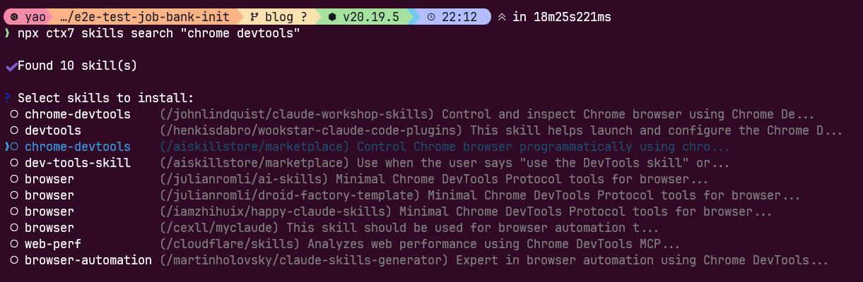 這裡分別需要 chrome-devtools、playwright skill,現在透過 context7 可以很快速的安裝