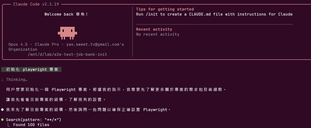 我建立了一個空白專案,我裝了 Skill、最佳實踐 yaochangyu/e2e-test-job-bank-init,執行你的 AI 工具,依照順序輸入提示詞