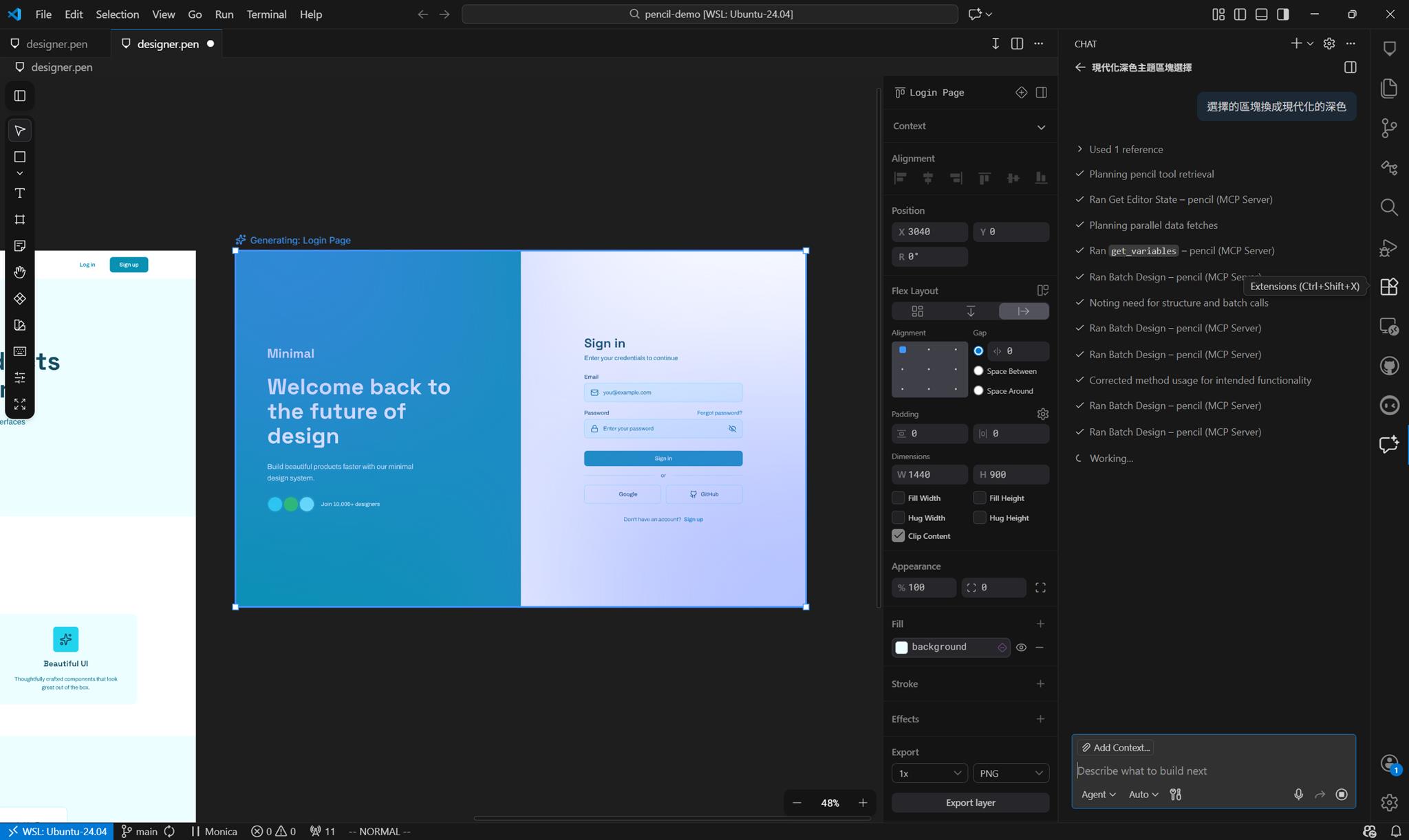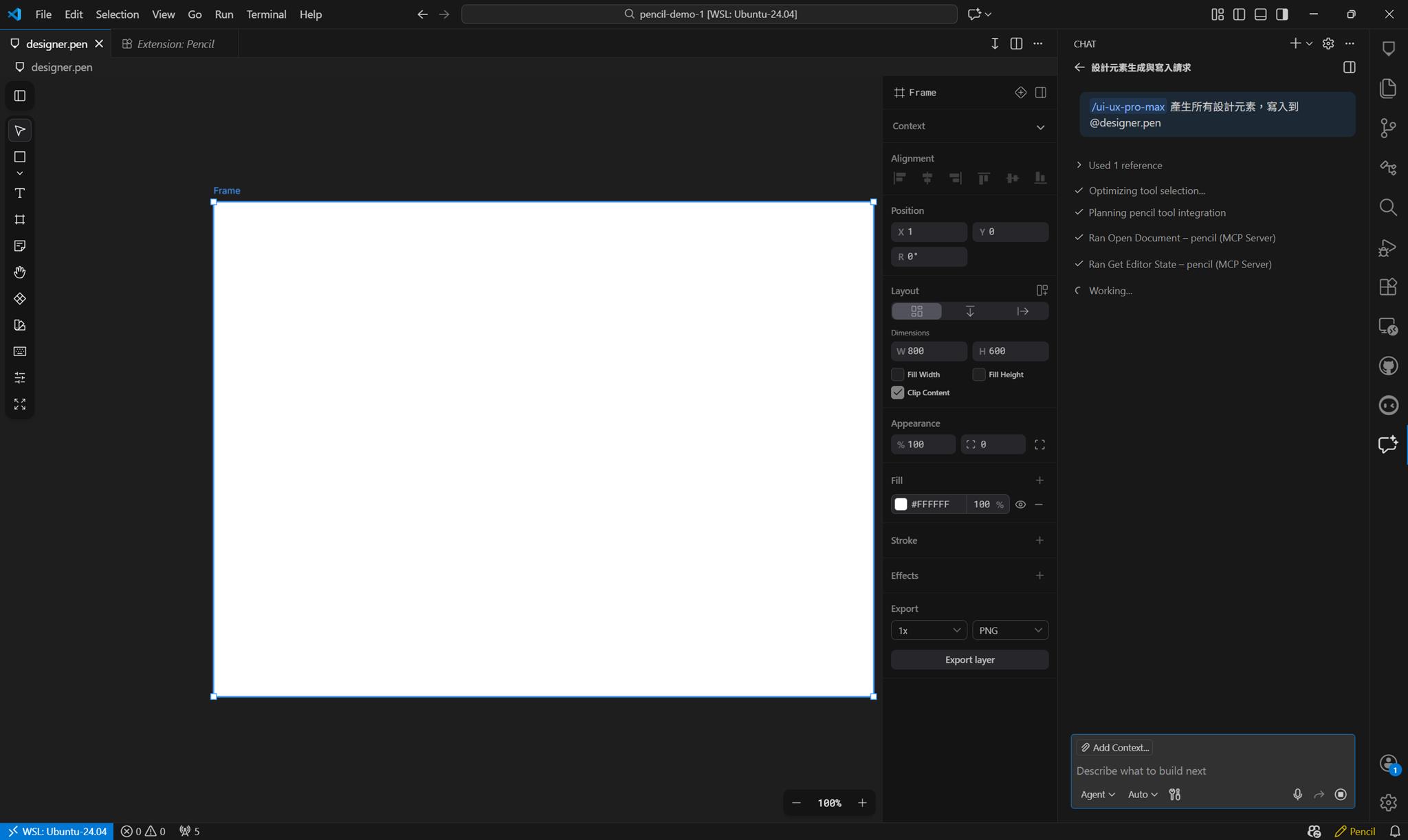 產生設計元素 焦點這時候停在 .pen 的畫布上, 在 AI 對話框中輸入以下指令: