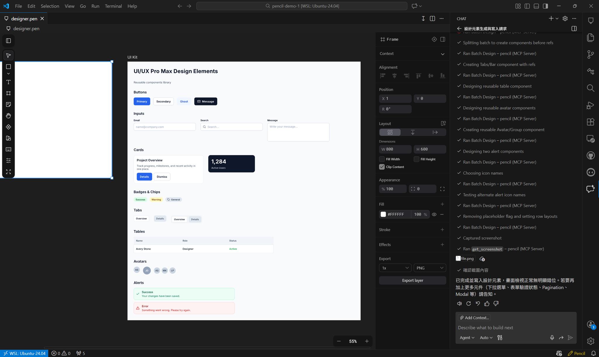 提供清晰的答案,AI 助手就能產生符合你需求的設計元素集合,並將其寫入到 @designer.pen 檔案中。