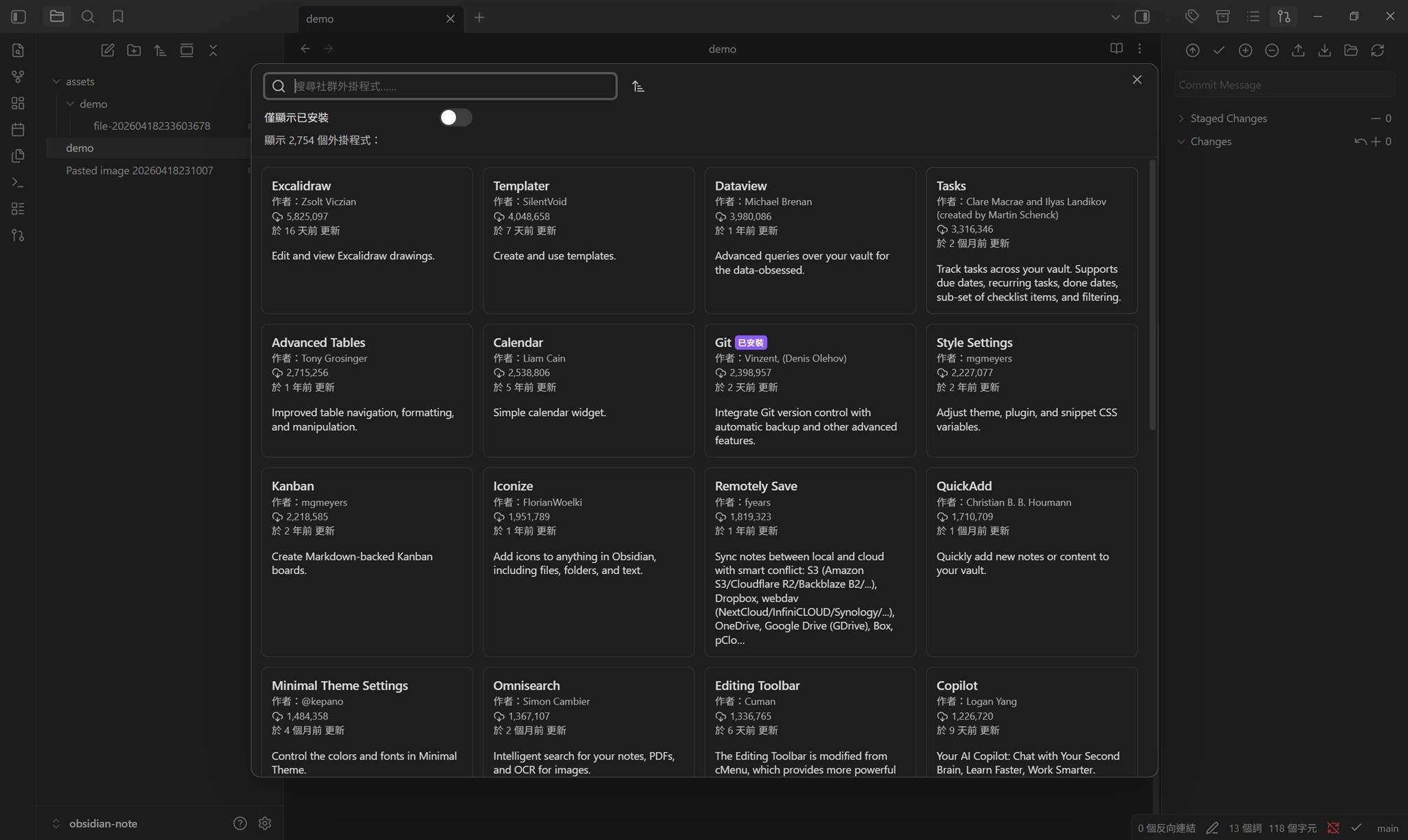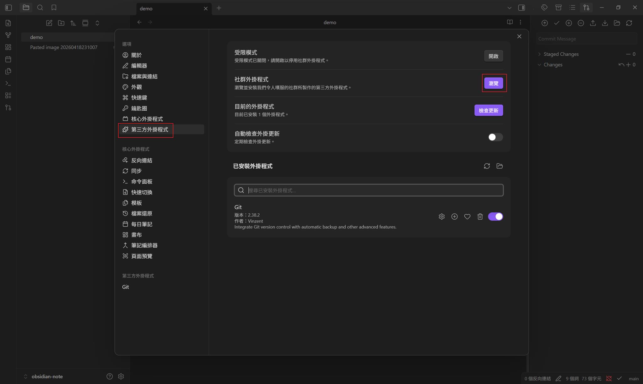 安裝完成後到第三方外掛程式安裝 Git、Custom Attachment Location、Remotely Save