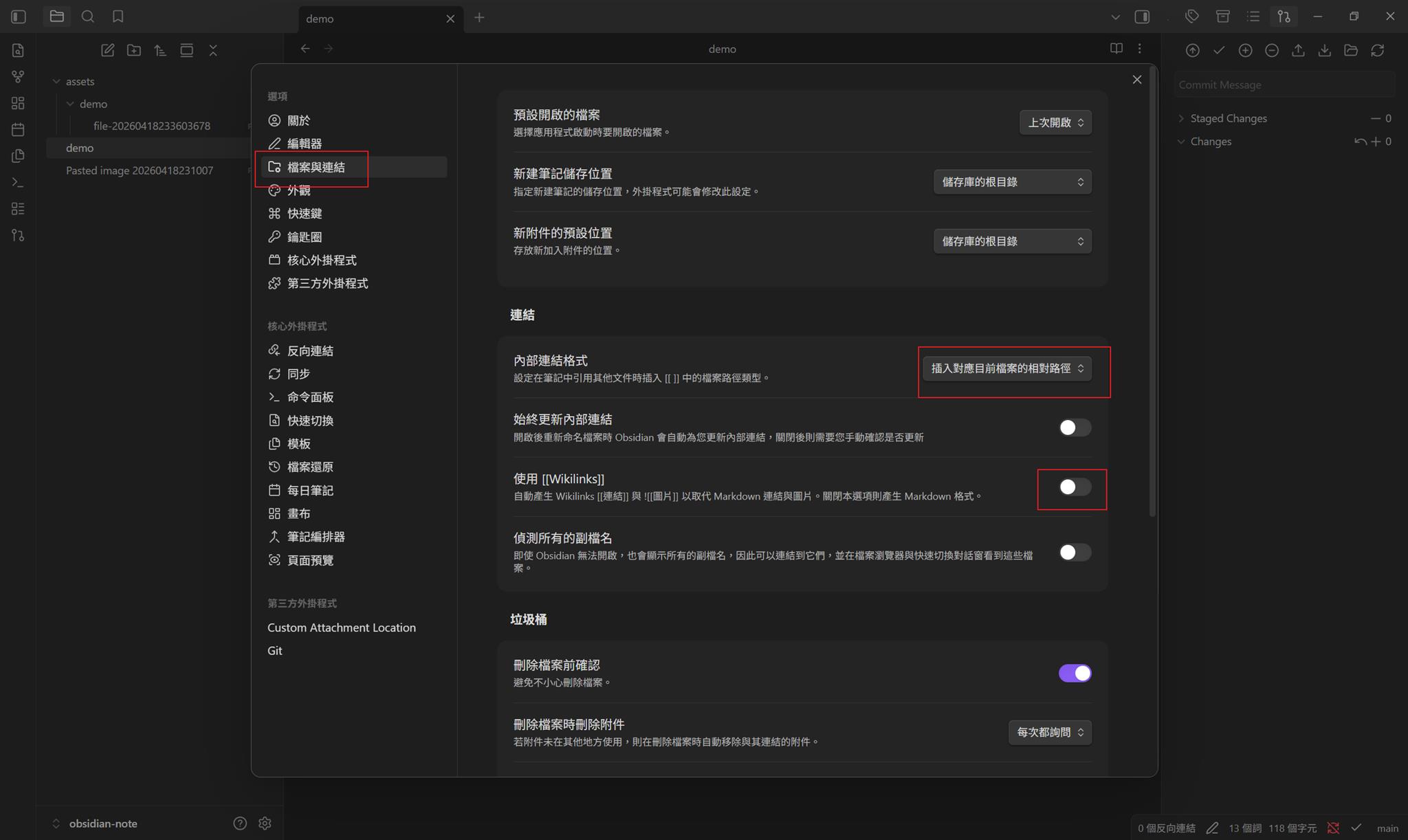 安裝好 Custom Attachment Location 後,在檔案與連結,內部連結程式設定為 插入對應目前檔案的相對路徑、關閉使用 [[Wikilinks]]。