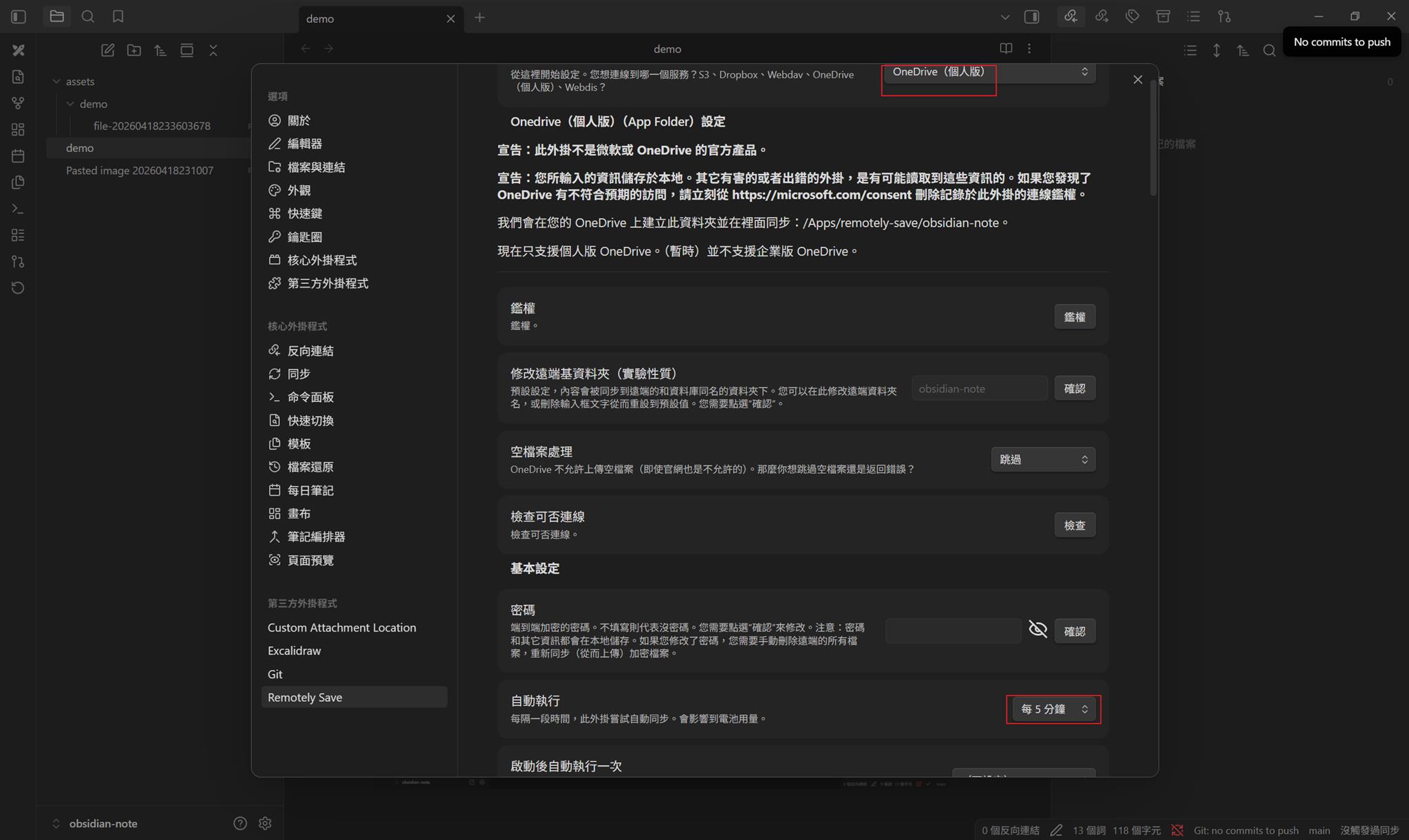 除了同步到 github,這裡我選擇 OneDrive,每五分鐘上傳一次,