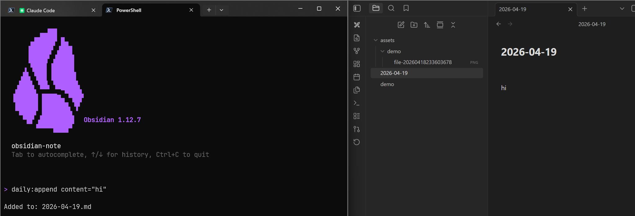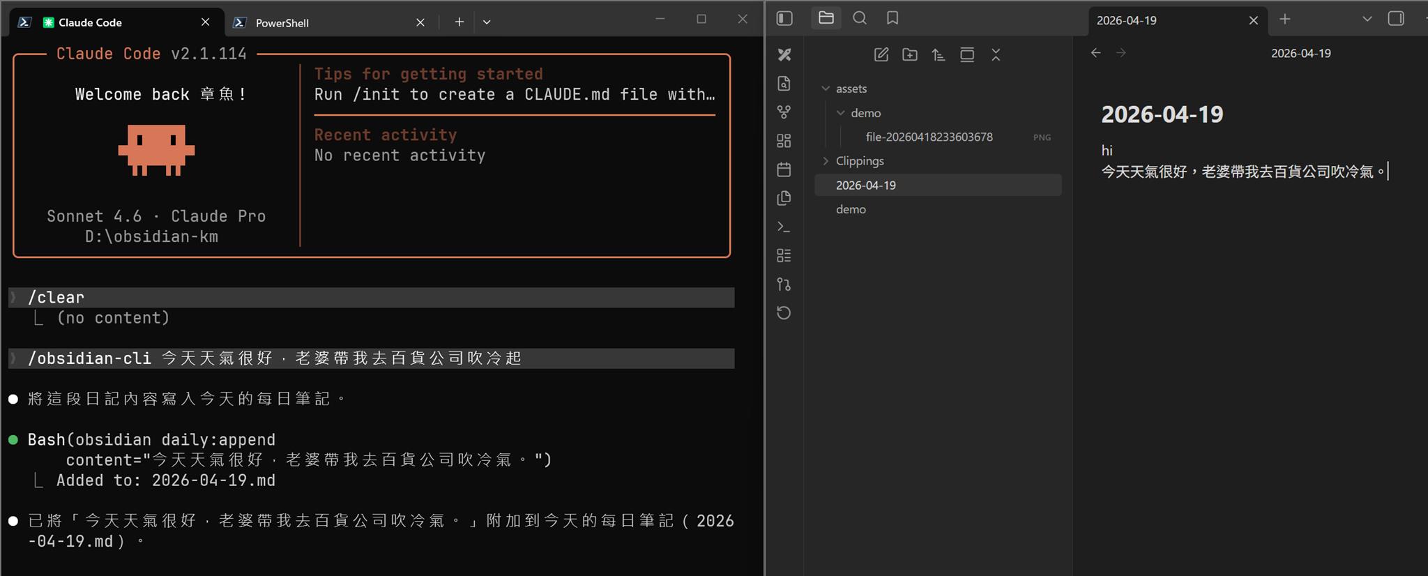 插一段文字給 obsidian,daily:append content="hi"