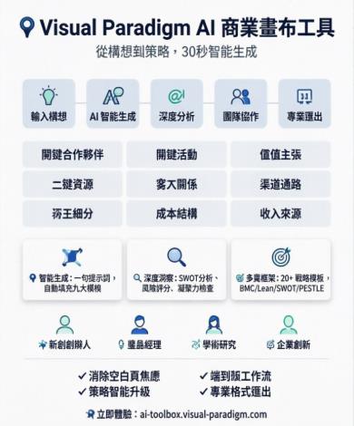 - Visual Paradigm AI 商業模型畫布工具解決方案: 官方介紹 AI 驅動的商業畫布工具,涵蓋核心功能、應用情境與企業整合方案。