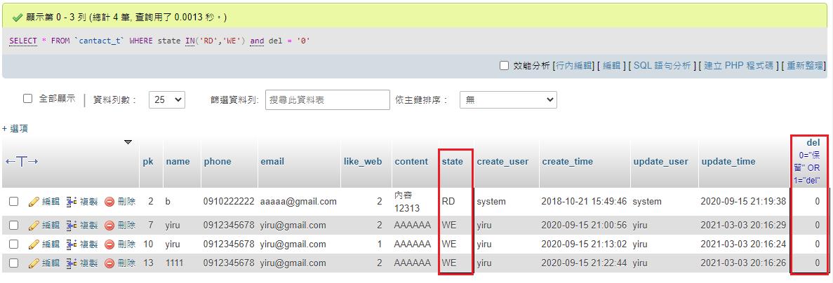 SELECT * FROM `cantact_t` WHERE state='WE' and del = 0 or state='RD' and del = 0 使用 WHERE IN