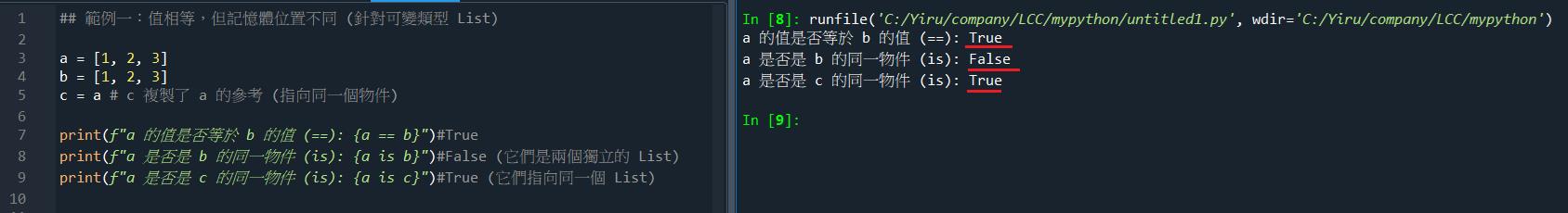 不同結果的產生: 對於可變類型(如 List 或 Dictionary),即使它們的值完全相同,它們通常是存在不同記憶體位址的不同物件,此時 == 為 True,但 is 為 False。範例程式碼: