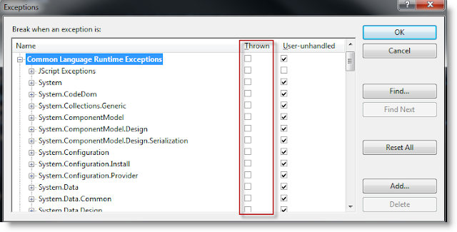 This is a known bug with x64 versions of Windows and the way exceptions are handled. One way to work around this issue while debugging is to go to the Debug -> Exceptions and select 'Thrown' for for the exception types you are interested in. This will stop the debugger when the exception is first hit (and before Windows eats it up).甚麼..!!這真是叫我情何以堪..文中建議到Debug功能表中,去設定Exception的項目,將你想要引發的錯誤類型勾選起來,像是下面這邊的設定