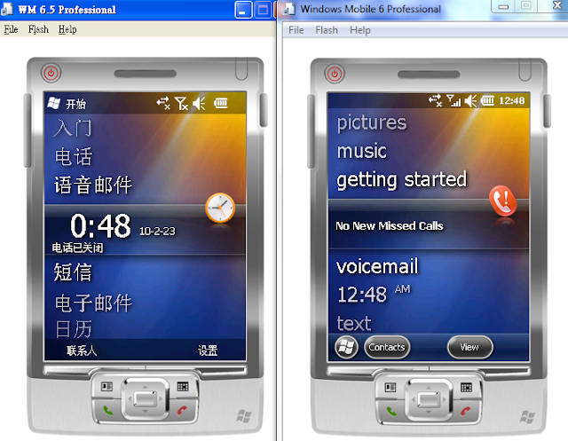 左邊是原先的6.5 DTK隨附的模擬器,右邊則是6.5.3 DTK的模擬器,可以看出在"開始"這個部分,在6.5.3之後改成下系統畫面的最下方,而讓最上方只留著一些訊息顯示(電池電量等);這樣在操作便利性上也會提升一些,例如在要關閉應用程式(點選X鈕)的時候,以往是在畫面的最右上角,而6.5.3也變成再下面的功能列了,像筆者這種短手指頭的相信做起來會更加的順手的。