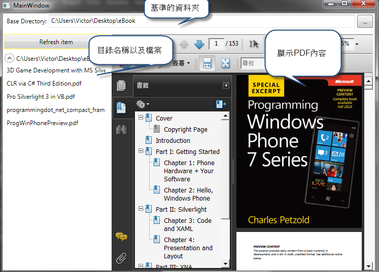 接下來在就是主畫面的部分,在功能的部分,我是想做到指定一個基本的資料夾,之後將該資料夾中所有的目錄列在第一層(利用Expender+StackPanel),目錄下面就列出所有PDF檔案,於是做了下面簡單的畫面