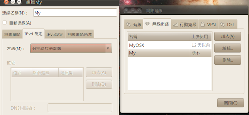 (記得其它上網的網路3g或有線網路要選分享,這樣無線網連上了才能出的去)