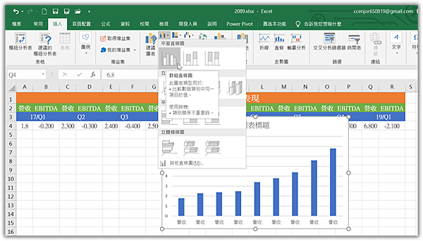 點取「插入 > 插入直條圖或橫條圖右方▼鈕 > 群組直條圖」圖示。
