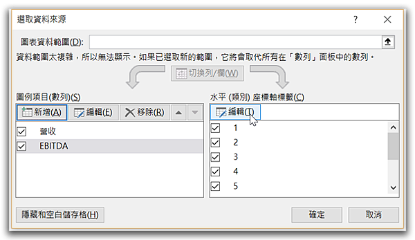 在【選取資料範圍】對話方塊,點取圖例項目的「編輯」鈕。