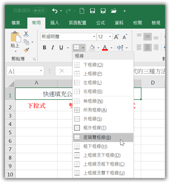 如果要針對儲存格內所有內容下面畫線,實際就是點取儲存格後,再點取「常用 > 框線右方▼鈕 > 選擇所要框線」項目