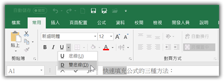 如果要針對儲存格內部份內容下面畫線,實際就是框選該內容後,再點「常用 > 底線右方▼鈕 > 底線/雙底線」項目。