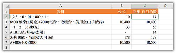 點取B2儲存格輸入公式「=SUMPRODUCT(TEXT(LEFT(TEXT(MID(A2&"a",COLUMN ($3:$3),ROW($3:$9)),),ROW($3:$9)-1),"0%;-0%;0;!0")*ISERR(-MID(A2,COLUMN($3:$3)-1,2)))」後,再複製到B3:B7儲存格。