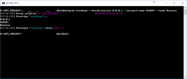 gulp testArgs --build-version 0.0.0.1 --project-name WebAPI --mode Release