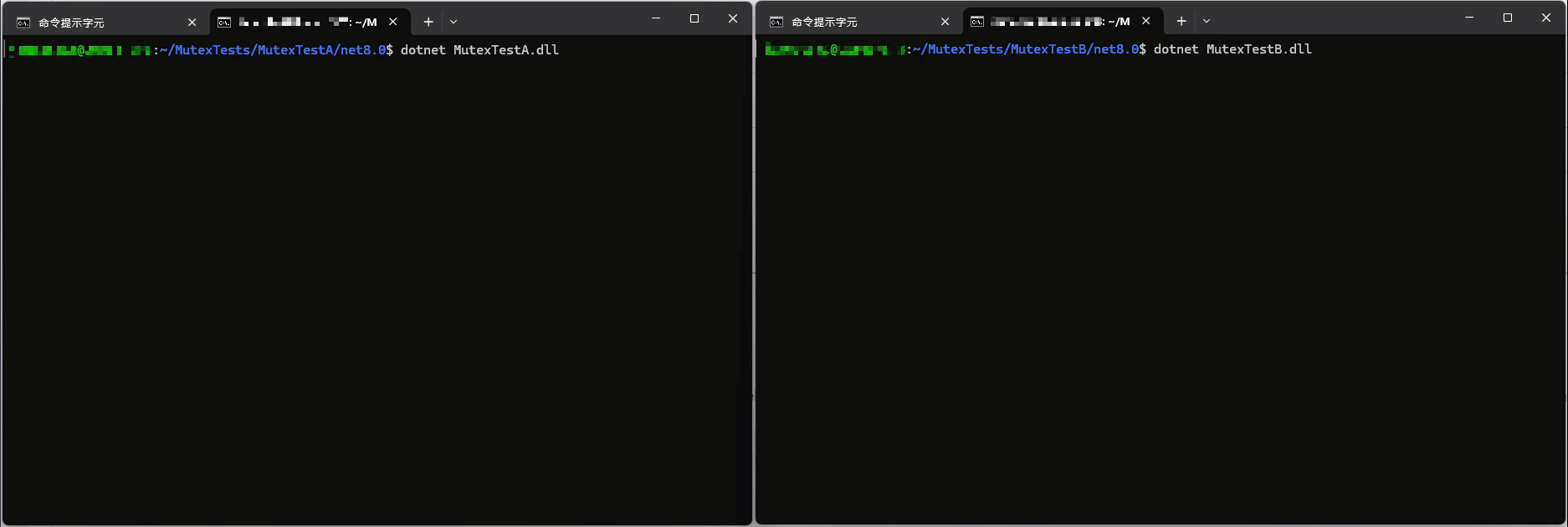 var mutexName = "Global\\TheMutexTest";應用程式 B 改變第一列的 mutexName 變數指定為 "Global\\TheMutexTest"。(C# 的 "\" 在字串中需寫為 "\\")