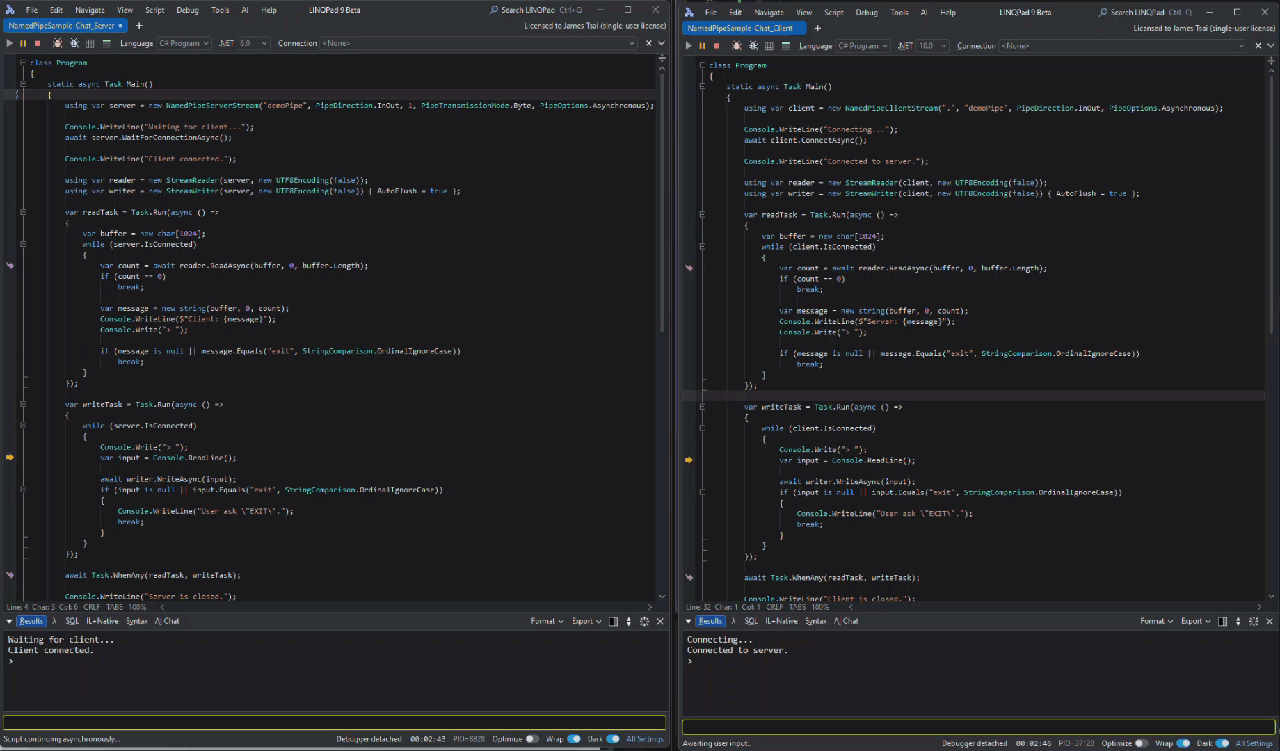 首先,皆在 Server / Client 中設計了兩個 Task,其中一個 Task 透過 StreamReader 不斷的在 Pipe 上讀取資料;另一個 Task 透過 StreamWriter 不斷的接收從 Console 輸入的資料後,寫到 Pipe 當中。