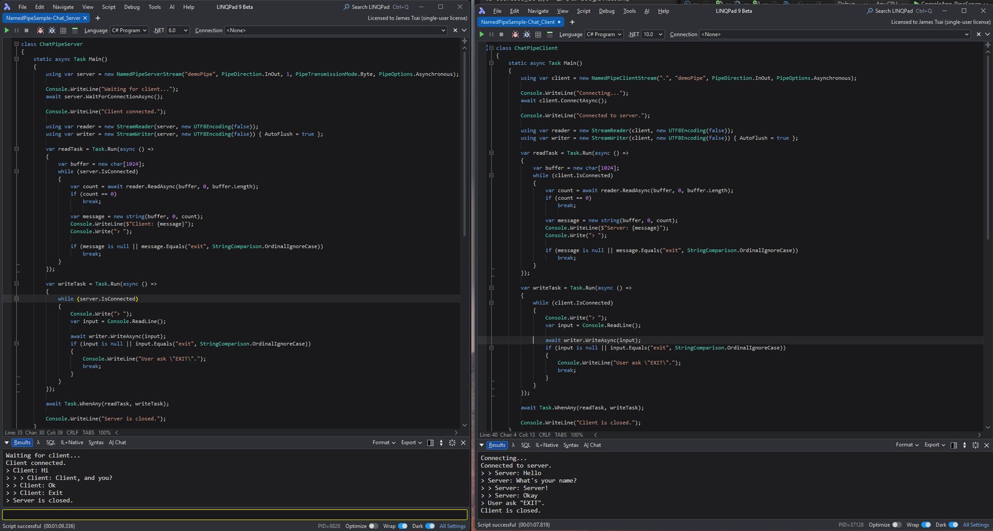 透過 LinqPad 做上述的範例程式的展示 (下圖左邊為 Server 端;右邊為 Client 端):