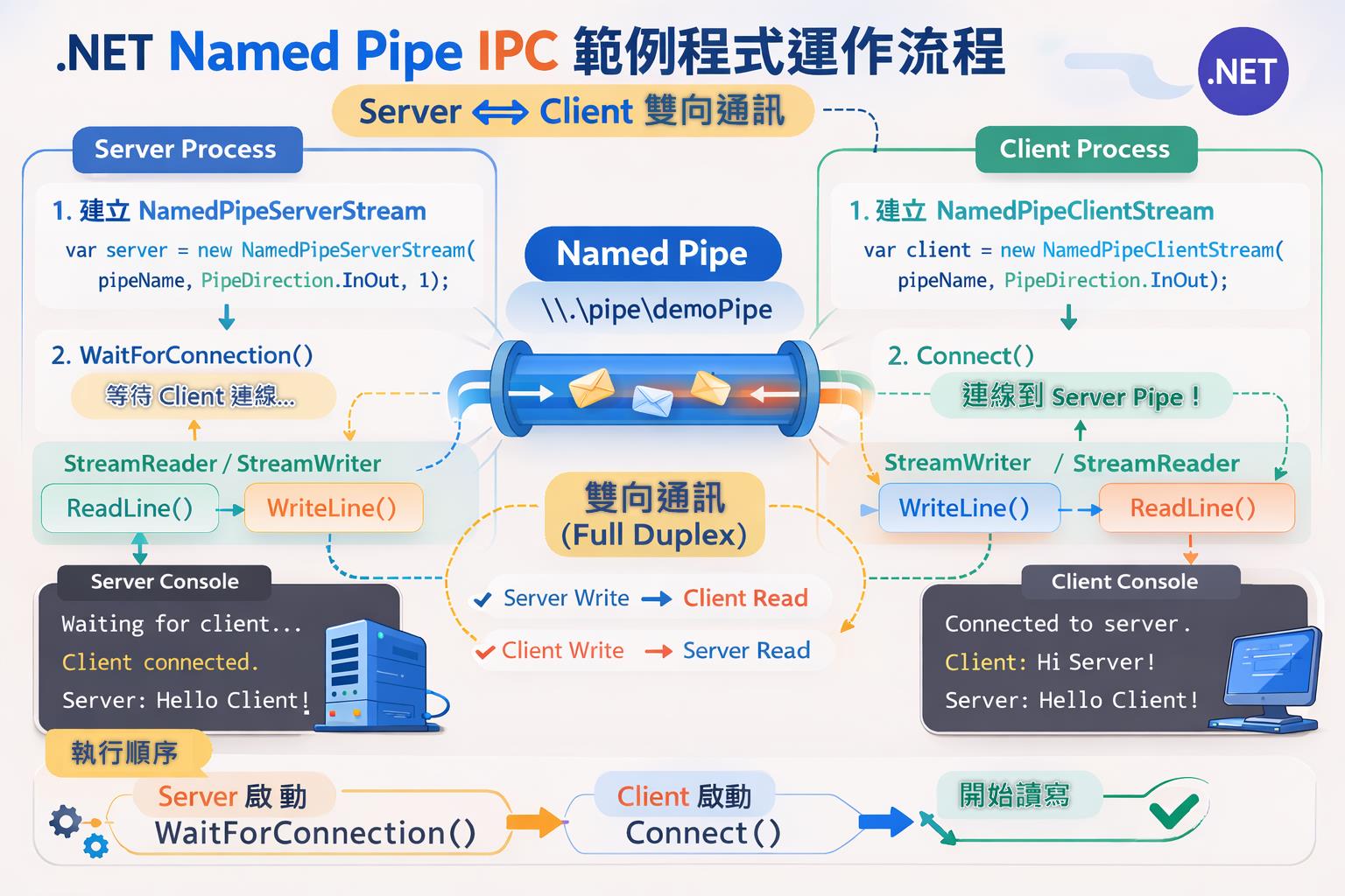 所以當 Client 同樣也透過 PipeDirection是 InOut 的 NamedPipeClientStream 連線成功後,可以透過一條 Pipe 讓 Server / Client 之間互相拋資料。