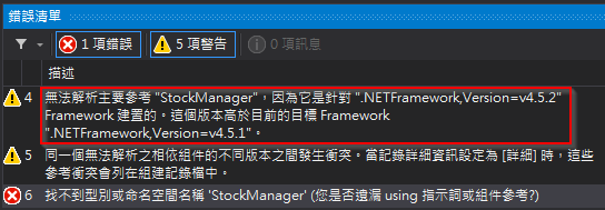 雖然我很迷惑, 因為我實在不記得我到底什麼時候把 StockManager 這個組件編譯成 .Net Framework 4.5.2 了 (我的所有組件都使用 4.5.1)。但是當我把它重新編譯成 4.5.1 之後, 所有問題都迎刃而解了。