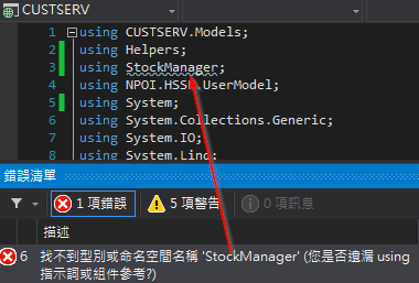 為什麼 VS 會在一行 using 敍述中說你遺漏了 using? 我可以確定這個組件已經加入參考; 否則這個 StockManager 命名空間的下面不會是綠色波紋線, 而應該是紅色的。