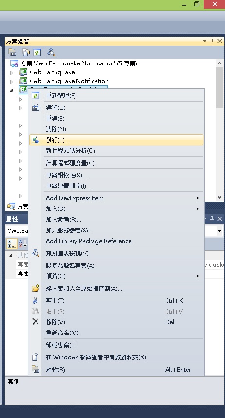 1.如下圖,當我發行時 使用滑鼠右鍵(對專案) -> 屬性 後指向到發行位置